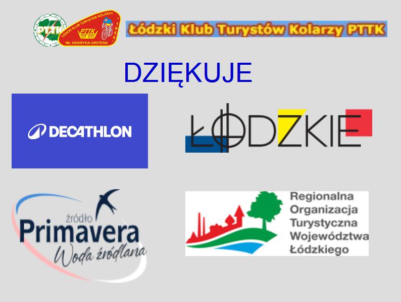Łódzki Klub Turystów Kolarzy PTTK im. Henryka Gintera w Łodzi składa podziękowanie Decathlon Łódź , marce Primavera woda źródlana, Departamentowi Sportu i Turystyki przy Urzędzie Marszałkowskim Województwa Łódzkiego oraz Regionalnej Organizacji Turystycznej Województwa Łódzkiego za pomoc w przygotowaniach do